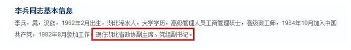 另据湖北省政协网站此前更新的“政协领导”栏目信息,李兵已任政协党组副书记。