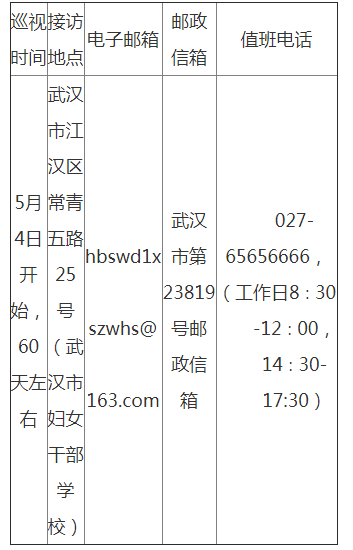 省委第一巡视组在武汉市巡视期间,具体联系电话、邮政信箱等如下: