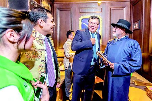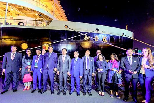 一进入船舱,穿着旗袍洋装的演员正在舞池里起舞,嘉宾们纷纷掏出手机拍照或者录影,当演员们邀请观众时,乌兹别克斯坦、俄罗斯等国代表团的嘉宾们欣然应邀,和演员们一起欢快起舞。