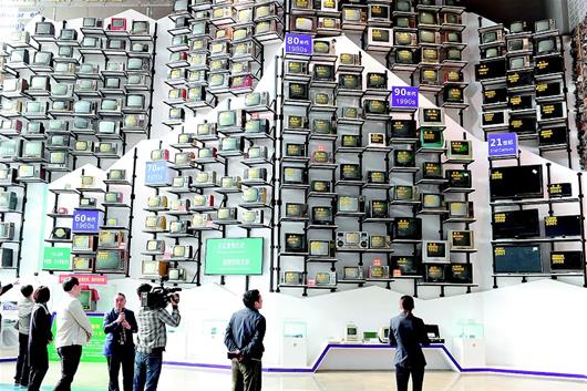 湖北日报讯 图为:格林美(荆门)电视博物馆内,电视墙高达10多米,密密麻麻摆满了旧电视机,按照年代,分门别类地陈放着,让人仿佛“穿越”了历史。馆中有一款上世纪50年代由国营天津无线电厂(七一二厂)生产的北京牌820型35厘米电子管黑白电视机,这是新中国生产的第一批电视机,被称作“华夏第一屏”。 (湖北日报全媒记者 周立新 魏铼 摄)