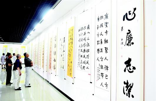 图为:为弘扬崇廉尚廉的新风正气,潜江市纪委监委、市文联联合主办“清风杯”廉政书画作品展。110件书法、国画及水墨漫画作品,紧扣廉政主题,或抒怀以言志,或激越以鞭策,令人警醒,催人奋进。图为7月2日,市民在观看廉政书画作品。 (视界网 吴燕军 摄)