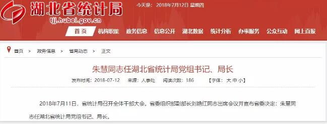 2018年7月11日,省统计局召开全体干部大会。省委组织部副部长刘艳红同志出席会议并宣布省委决定:朱慧同志任湖北省统计局党组书记、局长 。