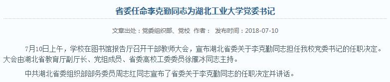 另据报道,原任湖北省统计局局长的是李克勤,1961年11月生,2013年任湖北省统计局局长、党组书记。据湖北工业大学官网显示,李克勤已任湖北工业大学党委书记。