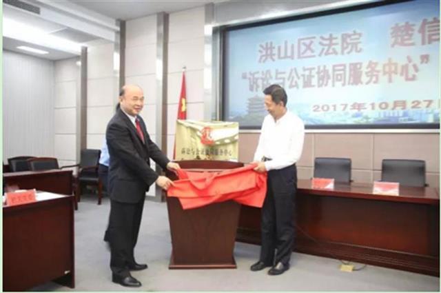 去年10月,武汉市洪山区法院和楚信公证处联合设立诉讼与公证协同服务中心。这是我省第一家由法院与公证处打造的多元化纠纷化解平台。该中心成立以来,法院在立案庭办公楼设立两间独立办公室和一个咨询窗口,法院授予公证处四名公证人员委托调解员资格,其中两名委托调解员常驻中心开展调解和咨询工作,另两名委托调解员不定期赴中心参与调解和咨询工作。
