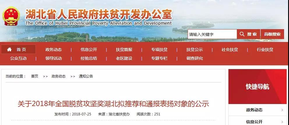 7月25日,省政府扶贫办官网发布了《关于2018年全国脱贫攻坚奖湖北拟推荐和通报表扬对象的公示》。