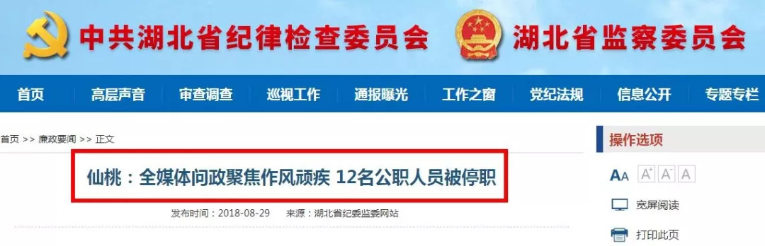 今日(8月29日),湖北省纪委监委网站刊文,报道了仙桃市近日举行的“百日专项整治全媒体问政活动”。梳理相关报道发现,在该问政活动的次日,即有1名干部被直接免职,12人停职并接受组织调查。