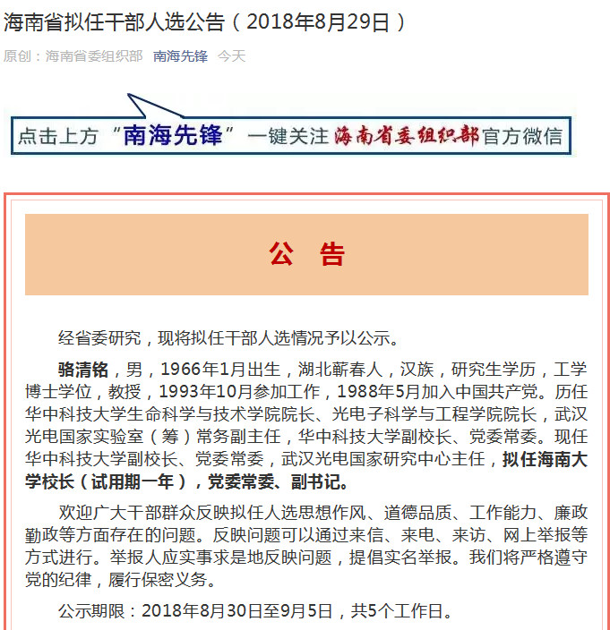 现任华中科技大学副校长、 党委常委,武汉光电国家研究中心主任 的骆清铭拟任拟任海南大学校长(试用期一年),党委常委、副书记。