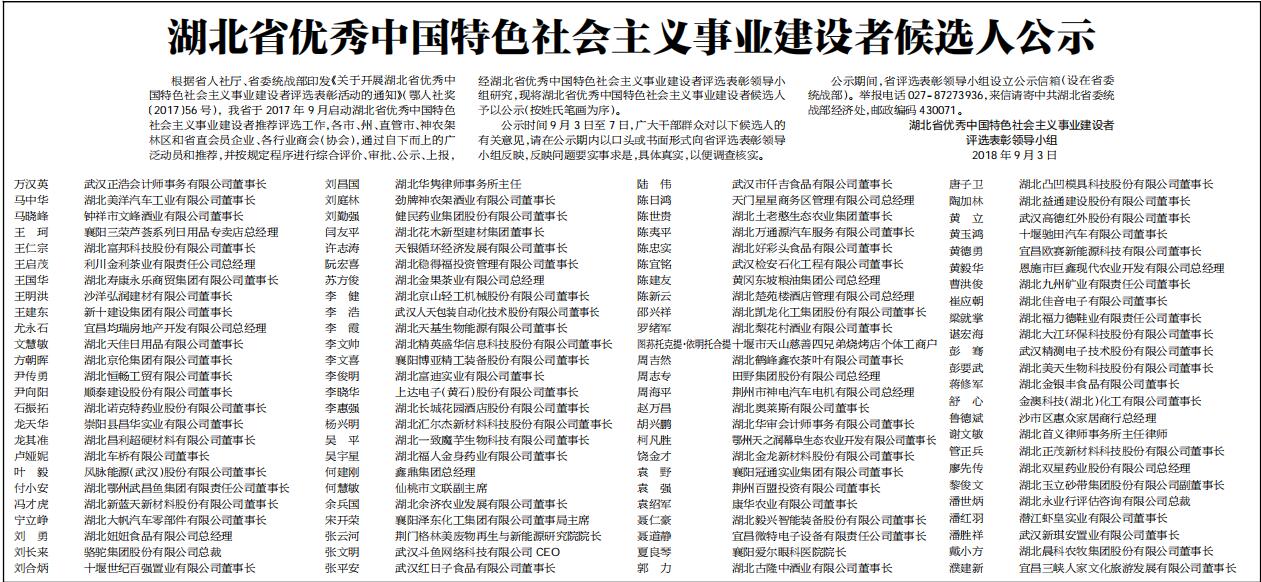 根据省人社厅、省委统战部印发《关于开展湖北省优秀中国特色社会主义事业建设者评选表彰活动的通知》(鄂人社奖〔2017〕56号),我省于2017年9月启动湖北省优秀中国特色社会主义事业建设者推荐评选工作,各市、州、直管市、神农架林区和省直会员企业、各行业商会(协会),通过自下而上的广泛动员和推荐,并按规定程序进行综合评价、审批、公示、上报,经湖北省优秀中国特色社会主义事业建设者评选表彰领导小组研究,现将湖北省优秀中国特色社会主义事业建设者候选人予以公示(按姓氏笔画为序)。
