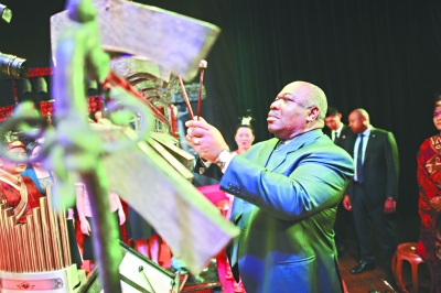 加蓬总统用编钟演奏自己创作的曲谱,赞美稀世珍宝曾侯乙编钟