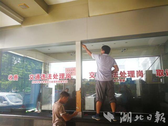 9月1日,荆州市交管局三大队组织人员拆除了办事大厅玻璃隔断。(荆州市交管局摄)