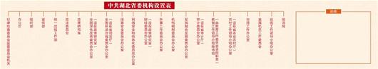 湖北省委设置纪检监察机关1个,计入机构限额的工作机关15个(设在相关部门或由相关部门承担职责的省委议事协调机构的办事机构不计入机构限额)。其中,办公厅挂省档案局牌子;组织部挂省公务员局牌子;宣传部挂省政府新闻办公室、省新闻出版局(省版权局)、省电影局、省精神文明建设指导委员会办公室牌子;统一战线工作部挂省政府侨务办公室牌子;网络安全和信息化委员会办公室挂省互联网信息办公室牌子;外事工作委员会办公室挂省政府外事办公室、省政府港澳事务办公室牌子;台湾工作办公室挂省政府台湾事务办公室牌子。教育工作委员会与省教育厅合署办公,不计入机构限额。