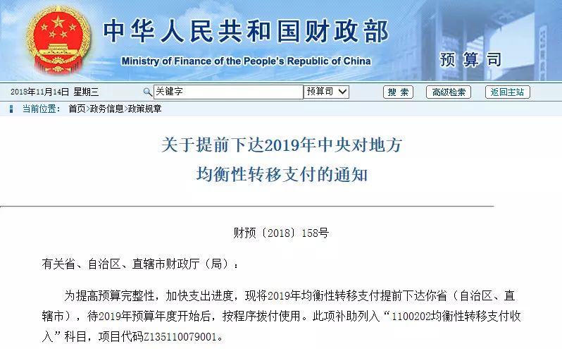 根据财政部日前下发《关于提前下达2019年中央对地方均衡性转移支付的通知》 ,为提高预算完整性,加快支出进度,财政部将2019年均衡性转移支付提前下达,待2019年预算年度开始后,按程序拨付使用。