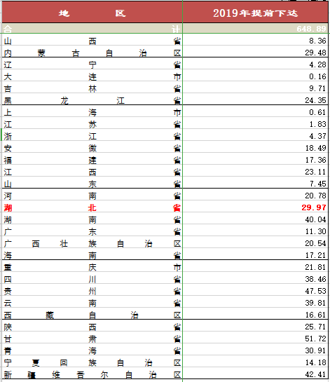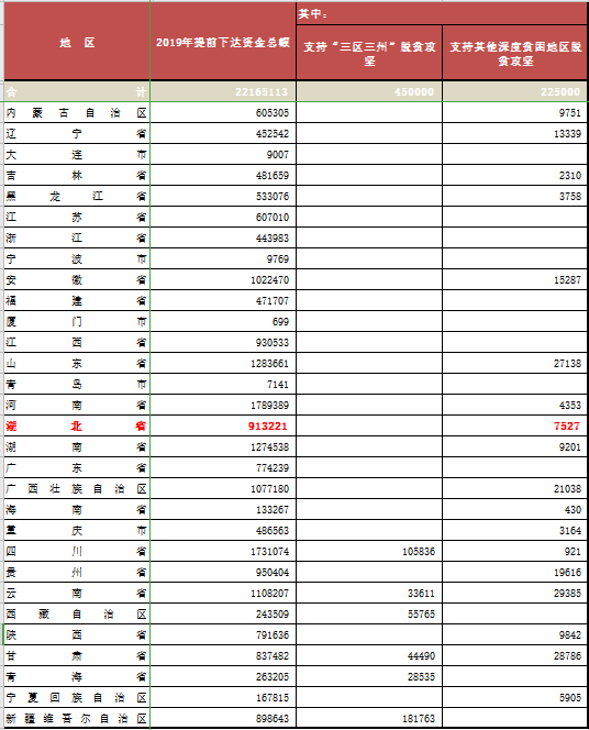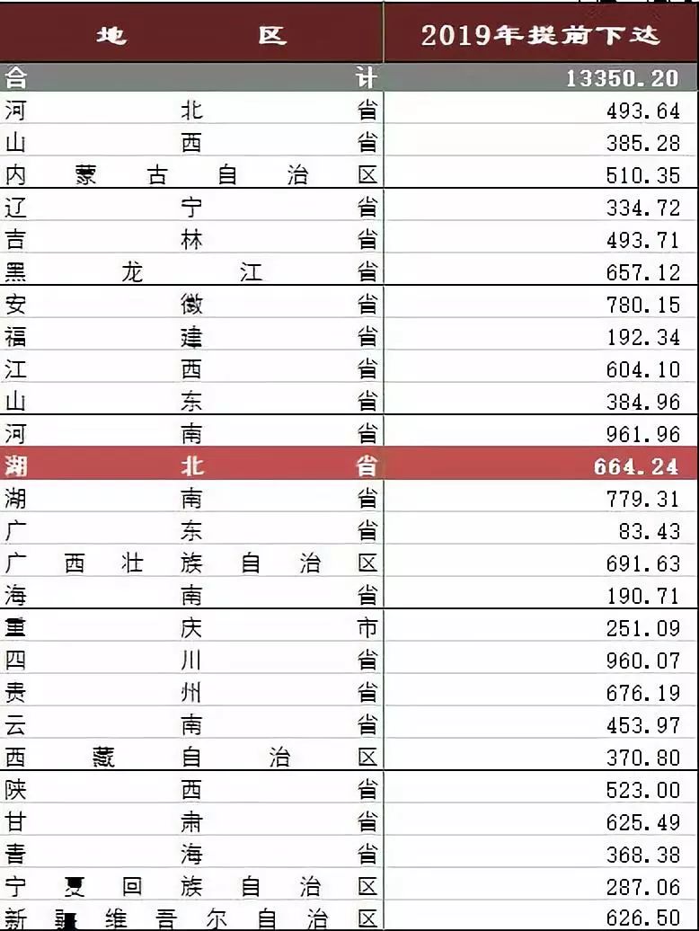通知所附的分配表显示,2019年提前下达的均衡性转移支付合计13350.2亿元。在获得支持的全国26个省份中,人口大省河南收获961.96亿元位居榜首,北京、上海、天津、浙江、江苏和深圳六个经济发达的省市未获得均衡性转移支付资金。