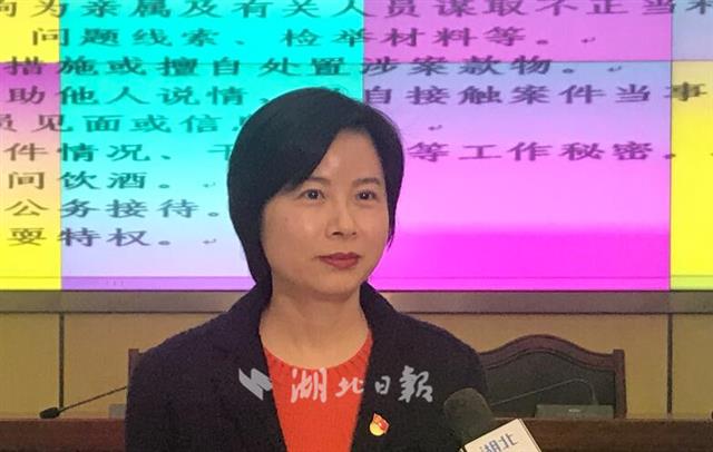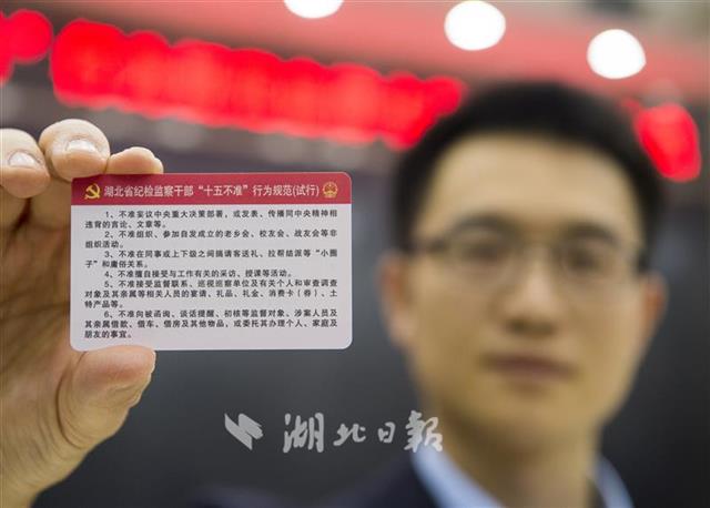 省纪委监委干部向记者展示自律卡上印制的“十五不准”行为规范内容。(湖北日报全媒记者魏铼摄)