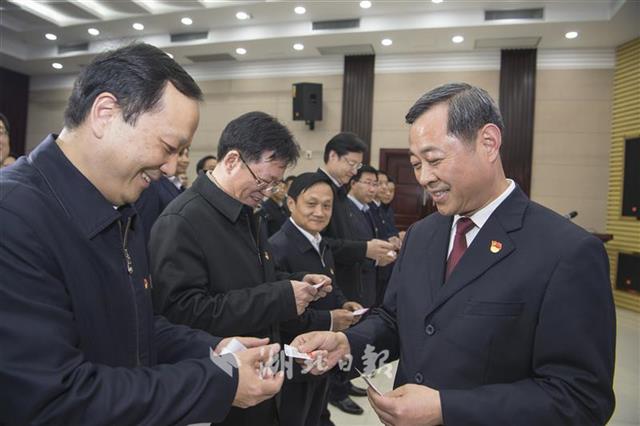 省委常委、省纪委书记、省监委主任王立山为省纪委监委领导班子成员等发放“十五不准”行为规范自律卡。