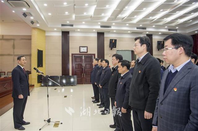 省委常委、省纪委书记、省监委主任王立山为省纪委监委领导班子成员等发放“十五不准”行为规范自律卡后,现场作讲话,要求各级纪委监委领导干部自觉做到“三个坚持”,严格自律,做好表率,当好标杆。(湖北日报全媒记者魏铼摄)