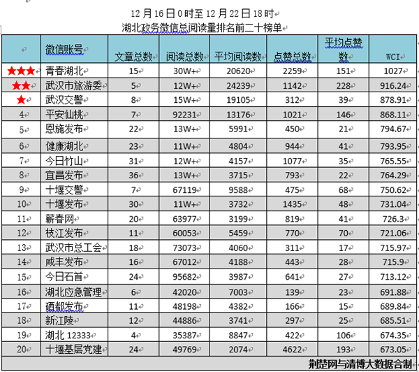 4、在继续发布“湖北政务微信排行榜”的同时,楚天舆情数据研究院还会挑选省内优秀的政务微信运营团队进行访谈,欢迎毛遂自荐,联系邮箱:jcwyqxxb@163.com。