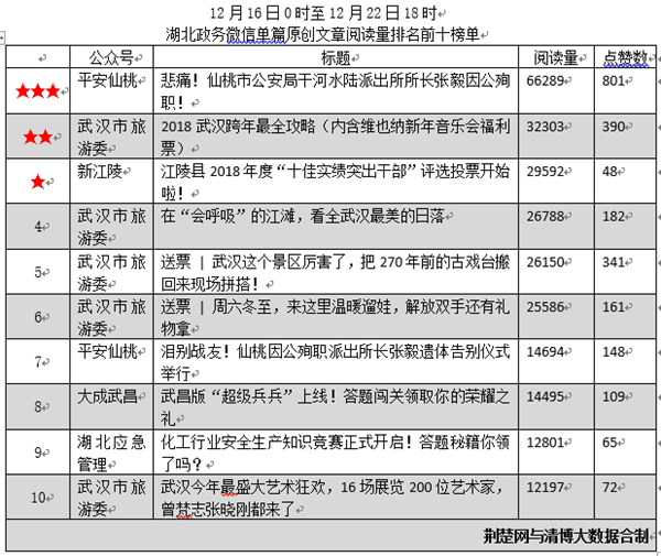 单篇原创文章排名方面,“平安仙桃”成为黑马,夺得第1名;“武汉市旅游委”夺得第2名,并且有5篇文章进入前十;黑马“新江陵”首次上榜就获得第3名的好成绩。
