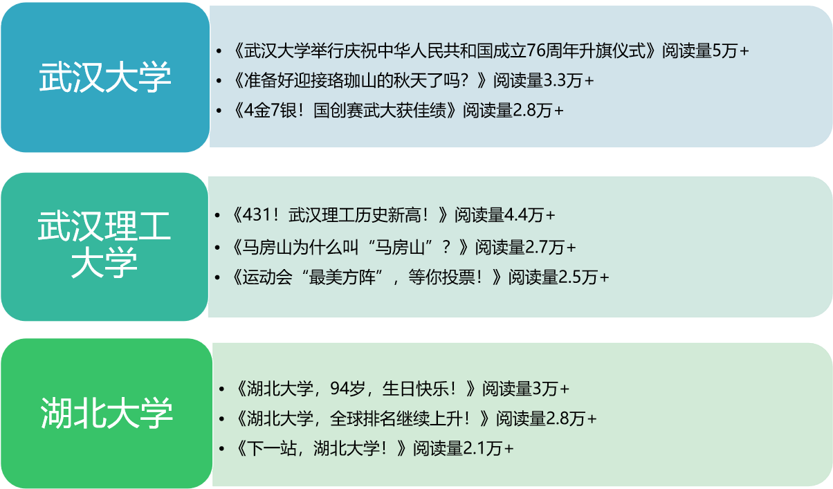 凭借荣誉硬核实力,塑造学校品牌标杆。多所高校围绕赛事成果和荣誉推文,树立了成果硬核、实力出众的品牌标杆。“武汉理工大学”“华中科技大学”分别发布《4金3银1铜!武汉理工历史新高》《2金5银13铜!华科大创最佳成绩》,聚焦可量化、可感知的硬核内容,既适配校园内部的口碑传播,也助力学校在社会层面塑造实力过硬、成果显著的品牌形象。“湖北大学”“三峡大学”还发布了《湖北大学,特等奖》《三峡大学,全国一等奖》,用极具冲击力的标题快速抓取注意力,让受众瞬间get学校赛事实力与发展潜力。
