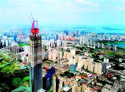 图为:武汉绿地中心使用“空中造楼机”。﹙图片由中建三局提供﹚