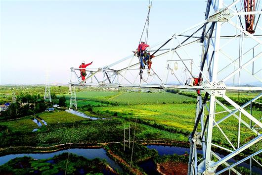 9月6日,在鄂州鄂城区汀祖镇,国家电网湖北送变电工程有限公司工作人员在吊装铁塔。鄂州变电站500千伏输电线路工程位于鄂城区汀祖镇和花湖镇境内,将大吉至磁湖500千伏双回线路断开,接入鄂州变电站,新建线路长度18.414公里,共51基杆塔。作为鄂州第一个500千伏变电站的配套线路,该工程不仅为鄂州市居民生活和工农业提供电力保障,同时为正在建设中的湖北国际物流核心枢纽以及鄂州货运机场提供用电支持。(视界网 邹小民 摄)