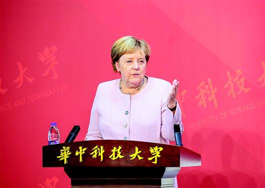 图为:9月7日,德意志联邦共和国总理默克尔,访问湖北武汉,并在华中科技大学发表演讲,与师生代表交流。