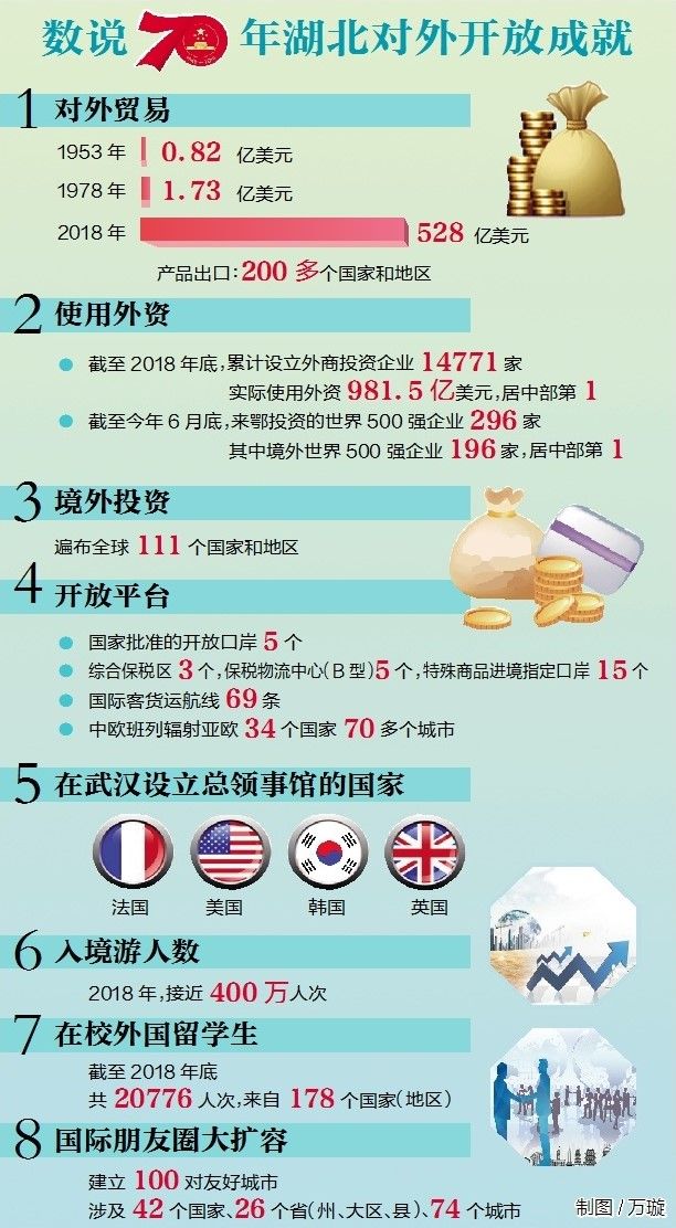 以开放促改革、促发展。70年来,湖北在对外开放道路上不断探索、实践和创新,实现了从封闭半封闭到全方位开放的历史飞跃。