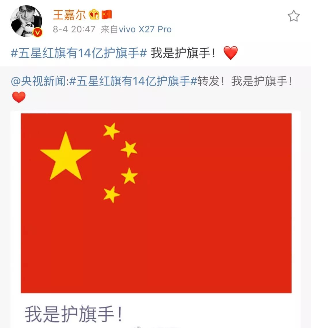 不少香港艺人包括成龙﹑陈伟霆﹑王嘉尔和陈晓东等,日前纷纷在微博转发“五星红旗有14亿护旗手”的内容,表示自己就是护旗手。这引起“港独”分子的不满。