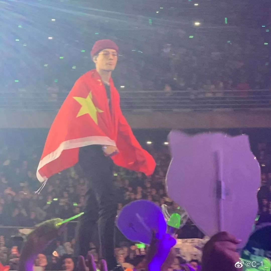 王嘉尔在智利演唱会上披国旗。图源:港媒