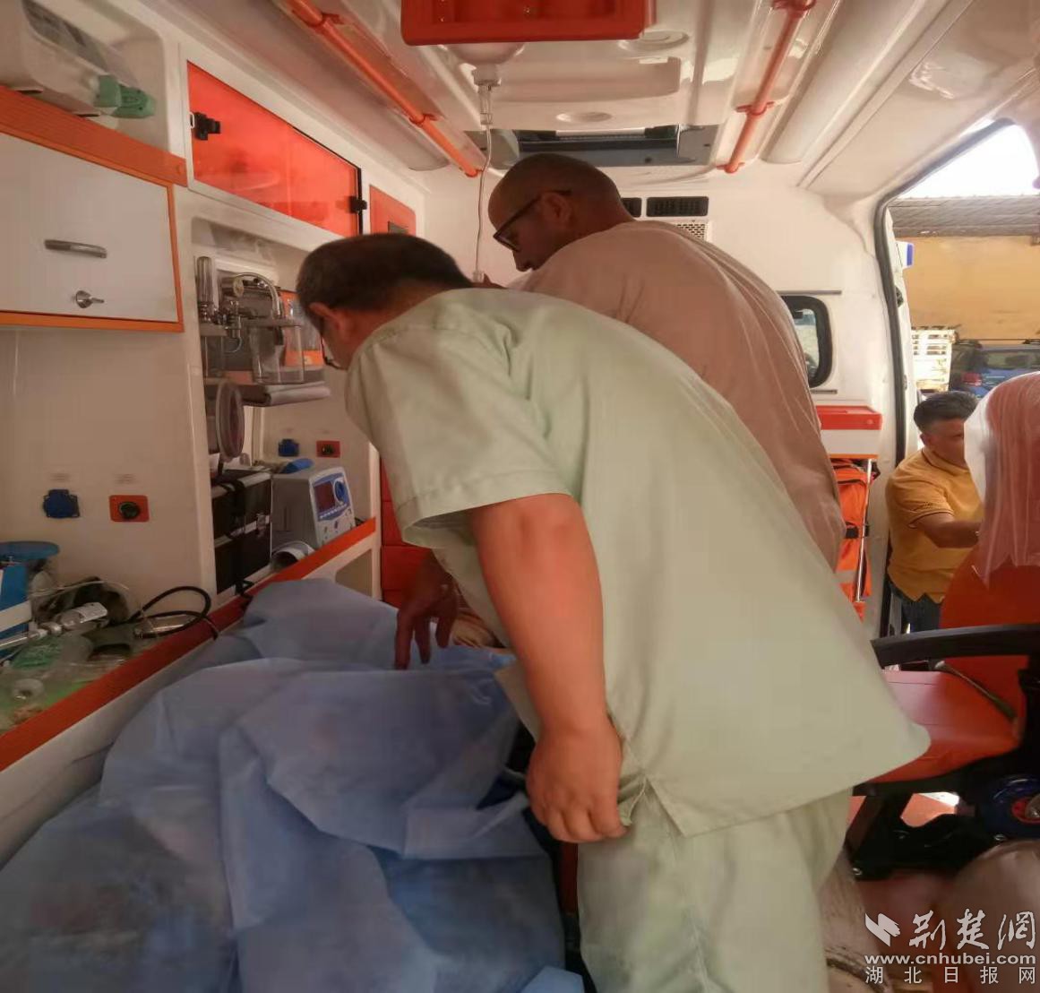 李文辉医生在转运途中检查救护车设备,查看病人病情。中国援助阿尔及利亚医疗队艾因迪夫拉分队饶从柏医生(来自黄冈市英山县人民医院)供图