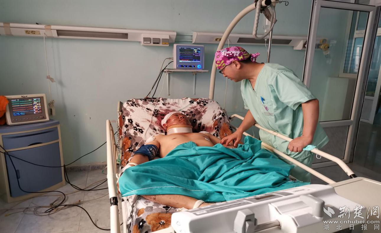 第一时间,医疗队员就进入复苏室,向当班医生了解情况,检查重伤患者的病情,商议治疗方案。难题一,重伤患者失血性休克,大面积头皮撕脱伤,颈椎骨折,全身多发软组织挫伤,患者意识障碍,处于浅昏迷状态。阿国医院的设备简陋,对重伤患者只进行了最基础的止血和骨折固定治疗,在国内很容易就能解决的问题此时变得困难重重。难题二,时逢阿国休息日,医院随后的3天时间里没有专科医生值班,继续等待在此治疗,无疑是在赌患者的运气。