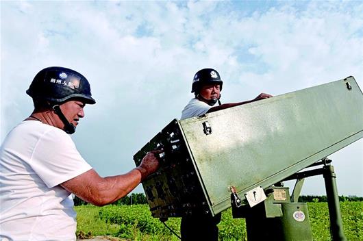 图为:潜江工作人员架起设备为人工降雨做准备