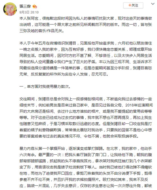 原文如下:本人张珂玄,很抱歉这段时间因为私人的事情叨扰到大家,现对这些天的事情做出说明,这可能是一个跟大家之前所见所闻截然不同的版本。而这一切,皆与张三弥及她的音乐/作品无关。