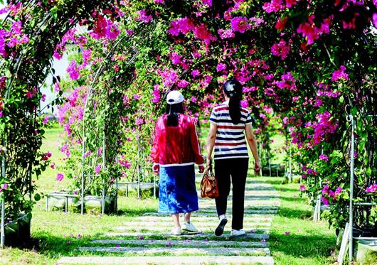 花博汇内,以欧式风情小镇为背景,玫红的三角梅、紫色的马鞭草,在灿烂的阳光下花开正艳。游人们忙着取景拍照,定格美丽瞬间。“花博汇是中国第一个网红小镇,100多位主播在这里常驻。”工作人员介绍。这里有年轻人喜爱的酒吧、轰趴馆、民宿等。去年国庆长假,花博汇共接待游客15万人次。
