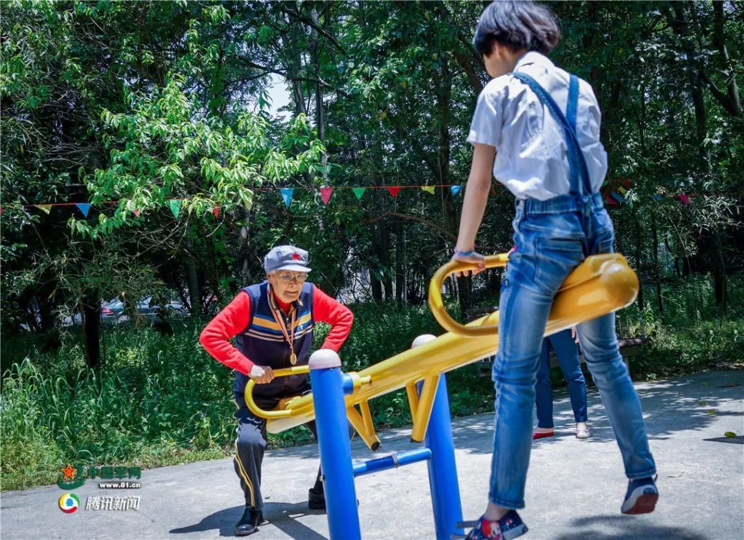 △秦华礼和孩子在一起玩跷跷板。夏一军 摄