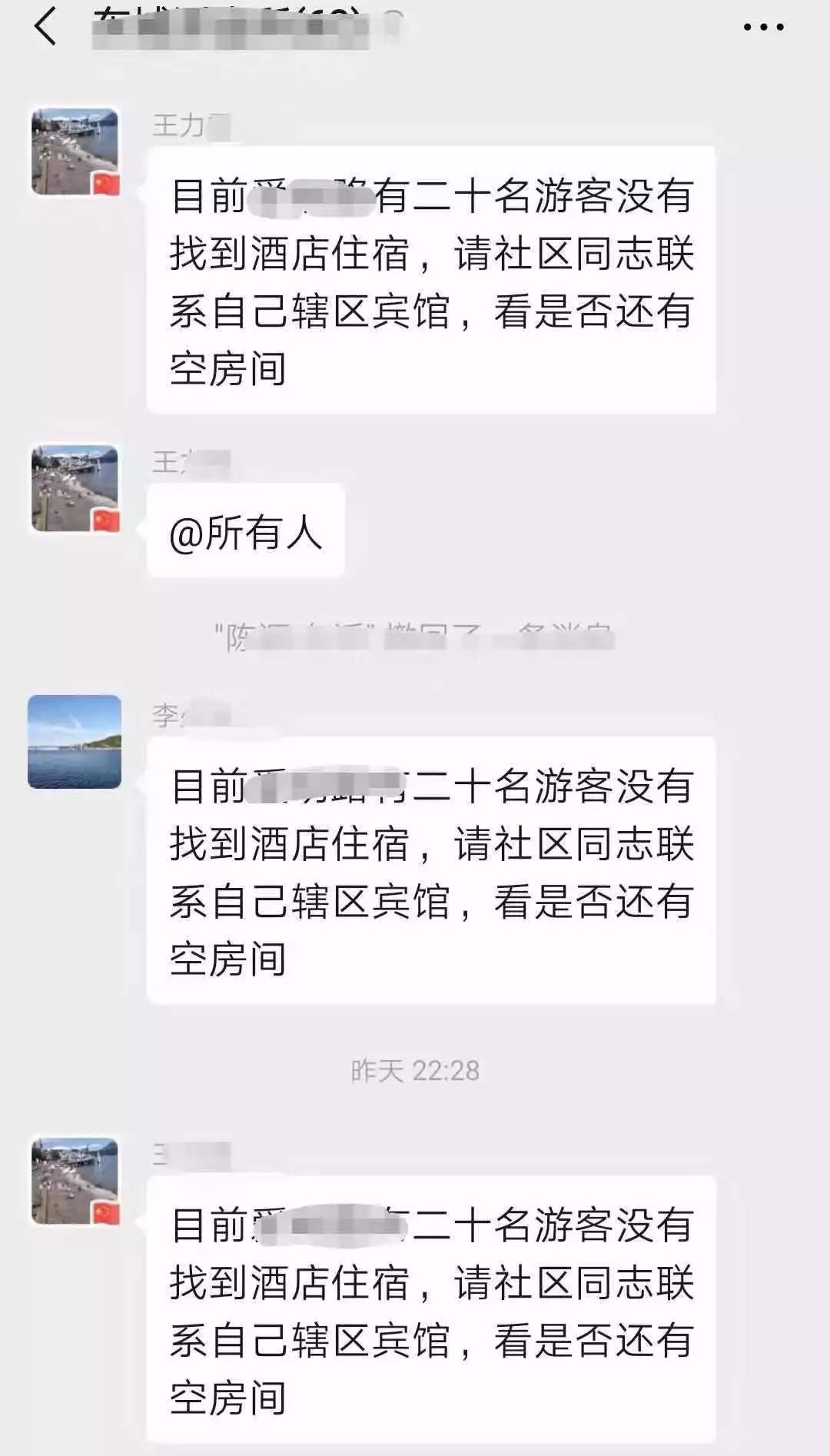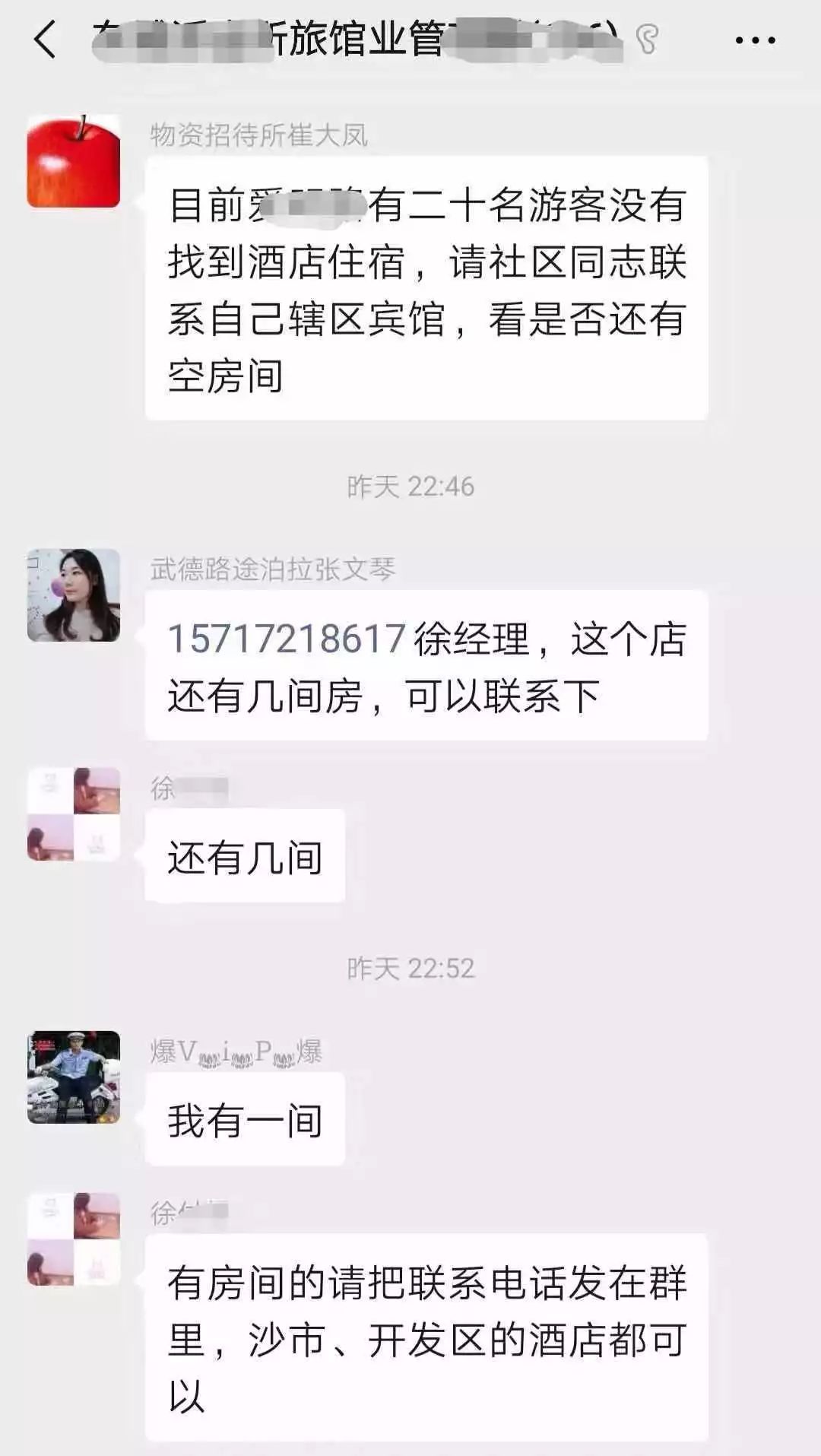 值班民警在工作微信群中发动同事一起协调宾馆。得这个信息后,所有社区民警自觉参与,通过电话、微信协调各个酒店、宾馆业主,询问、统计没售罄房间数,有的民警、辅警还主动提供自有空置房,供外地旅客住宿。