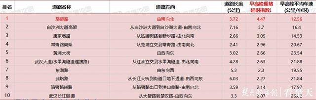 早高峰期拥堵延时指数排名前十路段