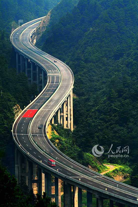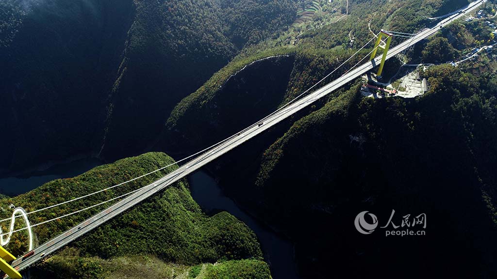 湖北巴东四渡河特大桥。桥面至谷底560米。雷声 摄