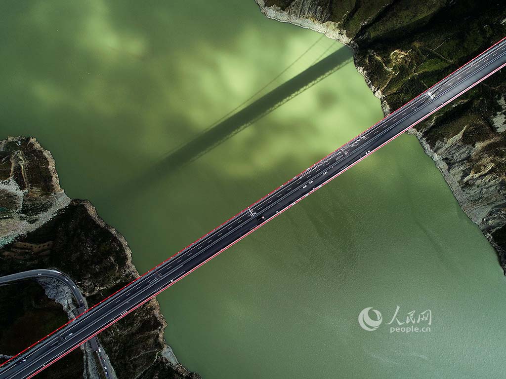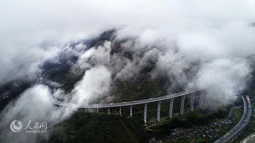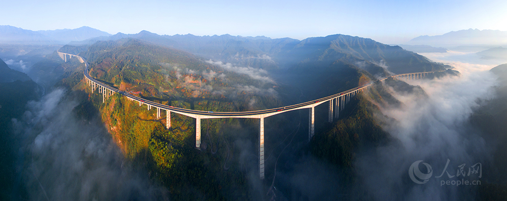四川干海子特大桥是世界第一座金钢管混凝土桁架桥梁,图中与其相连的双螺旋隧道穿山而过,为国际首创的双螺旋小半径曲线型隧道,在4公里的V形峡谷范围内连续爬升450迷,为克服海拔高差提供了新范本。黄刚 摄