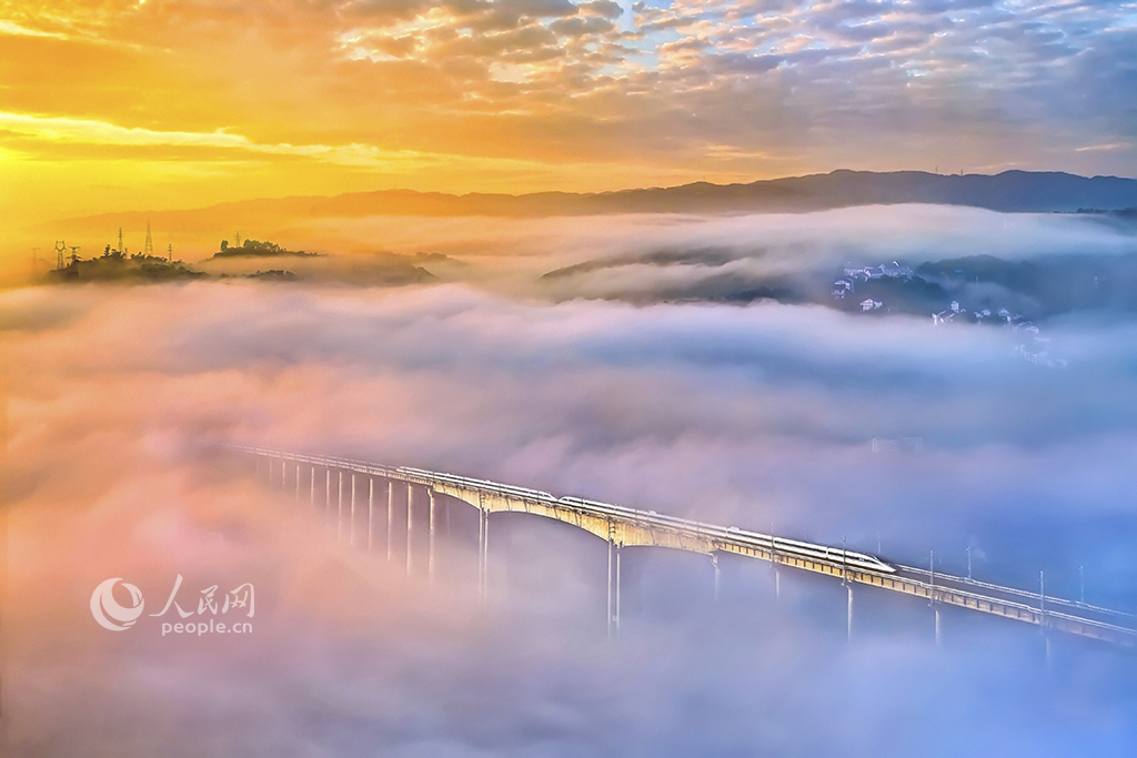渝(重庆)利(湖北利川)铁路龙溪河双线特大桥上,一列高铁穿云破雾,驶向远方。王永红 摄