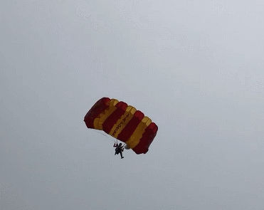 跳伞的定点比赛,是比落地。运动员从1000米的高度降落后,要尽力落在地面上电子靶盘的靶心上。如果触及直径仅有2厘米的靶心,则为最好成绩,计0.00分。也就是说,运动员落地位置距离靶心越近,分数越少,成绩越好。