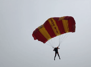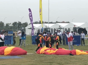 特技比赛,着重比速度,运动员的离机高度比定点项目更高,达到2200米。运动员跳离飞机后,要在没有开伞的状态下完成360°水平盘旋、360°向后翻转等相应规定动作。简而言之,速度越快、时间越短、质量越高,特技比赛的成绩越好。