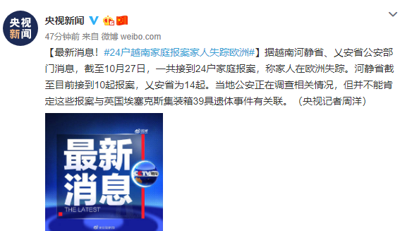 据越南河静省、乂安省公安部门消息,截至27日,一共接到24户家庭报案,称家人在欧洲失踪。河静省截至目前接到10起报案,乂安省为14起。当地公安正在调查相关情况,但并不能肯定这些报案与英国埃塞克斯集装箱39具遗体事件有关联。