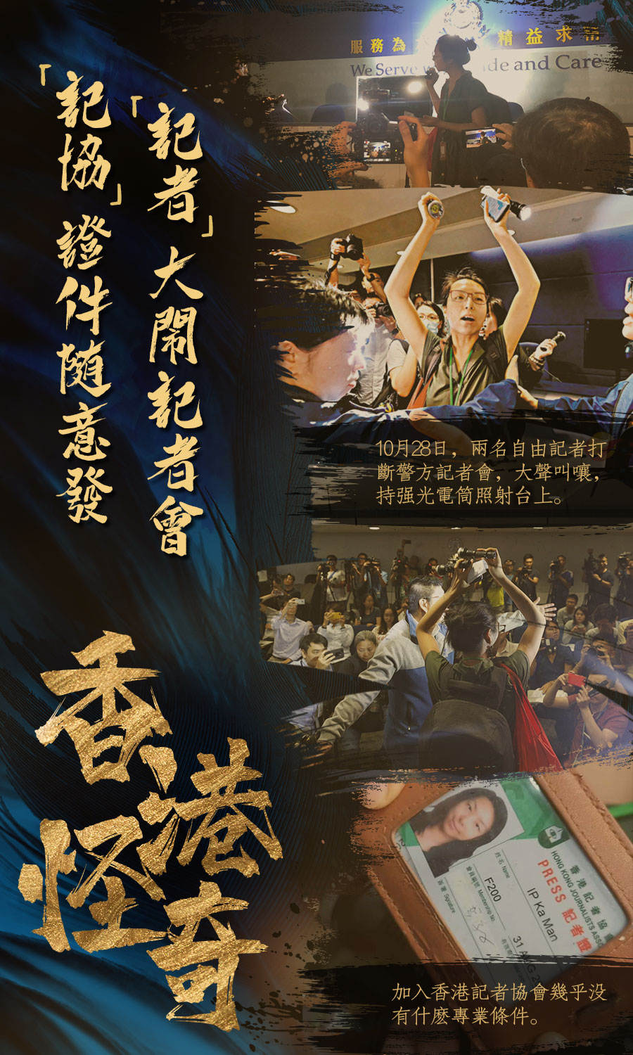 在前日的警方例行记者会上,自称记者的叶家文因为用电筒照向警方高层以示抗议而被逐;事后她用以进场的“记者证”在网上流传。网上看见,所谓“记者证”,只是香港记者协会编号F200的会员证,不是传媒机构的工作证。