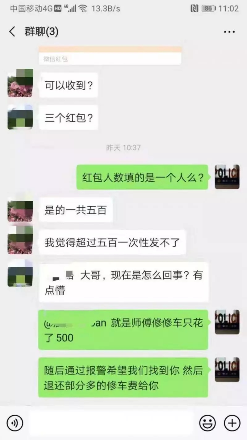 “我一开始猜测,可能是修车费不够用,对方来找我补偿。后来大家一合计,都认为可能遇到诈骗分子了。但我还是抱着试试看的心态进了微信群。”