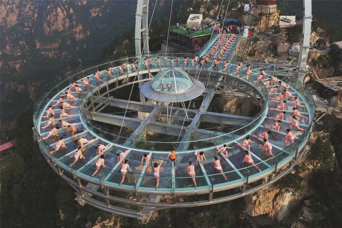 2016年6月19日,150余名瑜伽爱好者在北京平谷石林峡景区海拔700多米高的钛合金玻璃观景平台上练瑜伽。摄影/本刊记者 富田