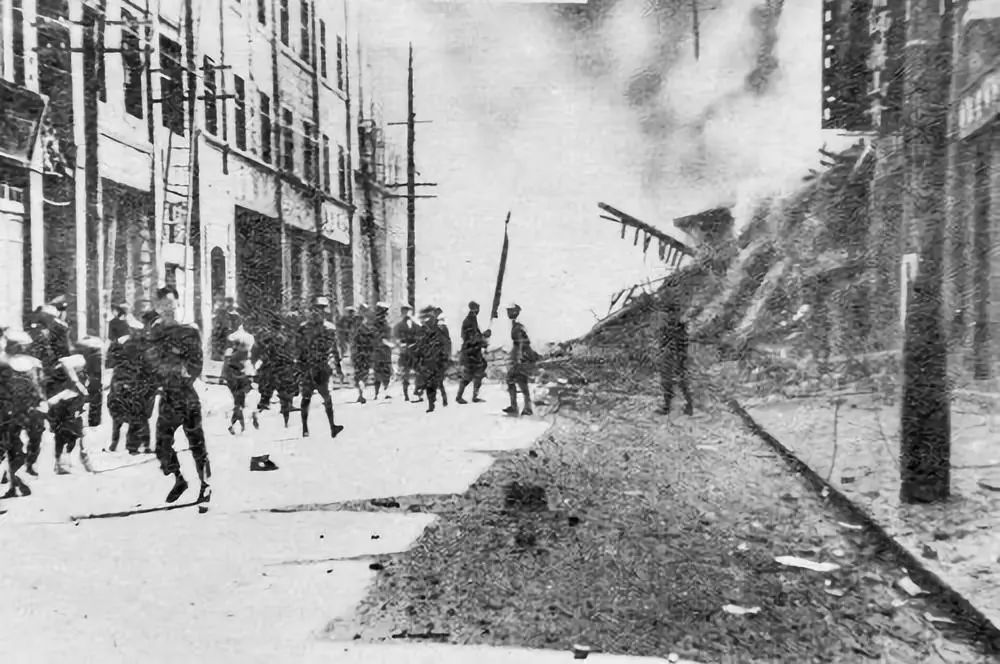 侵华日军轰炸重庆后,燃烧的房屋和街道。新华社发