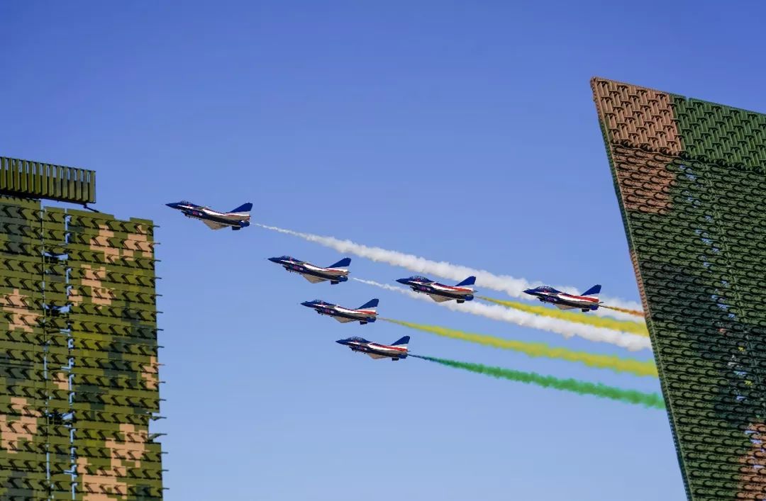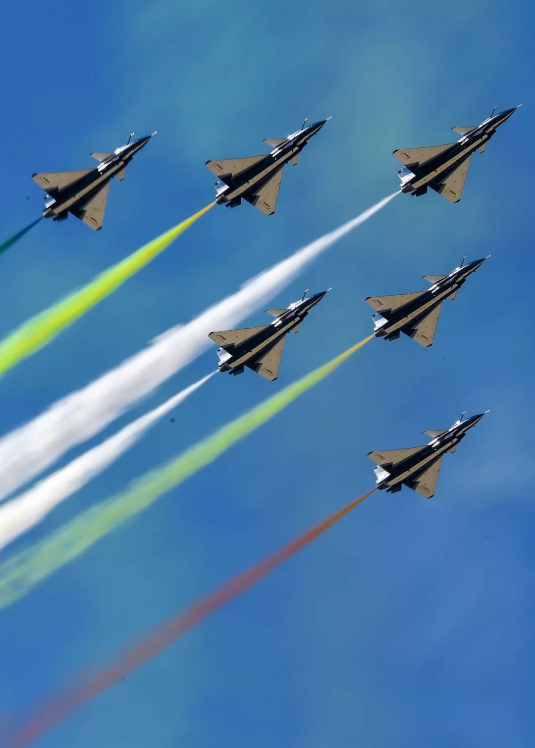 10月21日,在庆祝人民空军成立70周年为主题的航空开放活动上,空军八一飞行表演队歼-10飞机编队从静态展示的新型雷达上空飞过。新华社发(万全 摄)