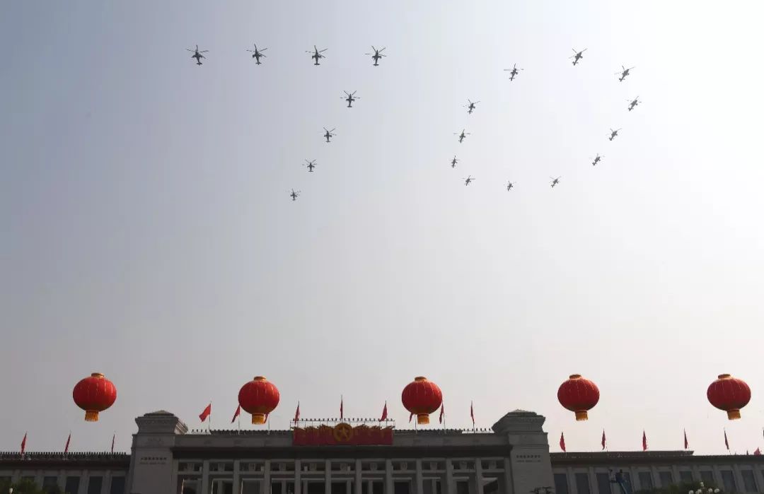 10月1日上午,庆祝中华人民共和国成立70周年大会在北京天安门广场隆重举行。这是领队机梯队。新华社记者 刘金海 摄