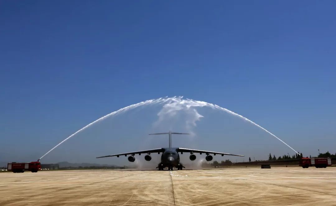 运-20飞机滑过水门,接受洗礼。2016年7月6日,中国空军运-20飞机授装接装仪式在空军航空兵某部举行。新华社发(刘畅 摄)